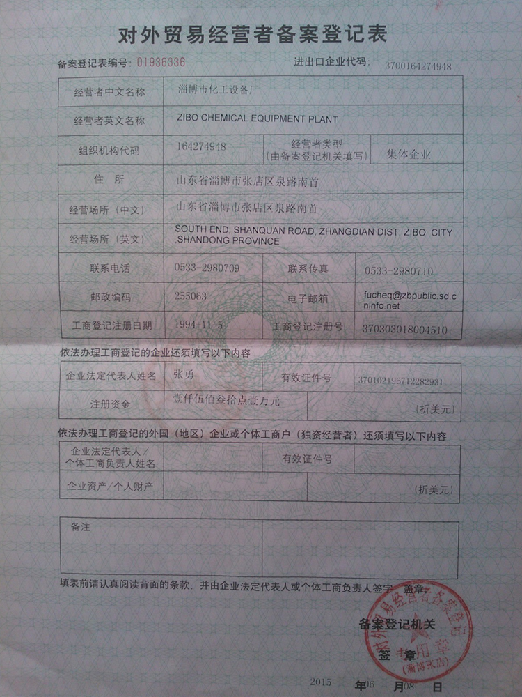 淄博市化工设备厂联系人:张勇 13505330686 电 话:0533-2980884 2980885 2980579 2980709 传 真:0533-2980710 邮 编:255063 E-mail:zcep@atkkasx.cn fucheq@zb-public.sd.cninfo.net 网 址://atkkasx.cn 厂 址:山东省淄博市张店区山泉路南首